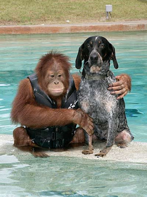 Suryia the orangutan and Roscoe a Blue Tick hound became friends when they crossed paths at a South Carolina preserve for endangered animals. Now they swim together, play together and Suryia even takes the dog for his walks.
